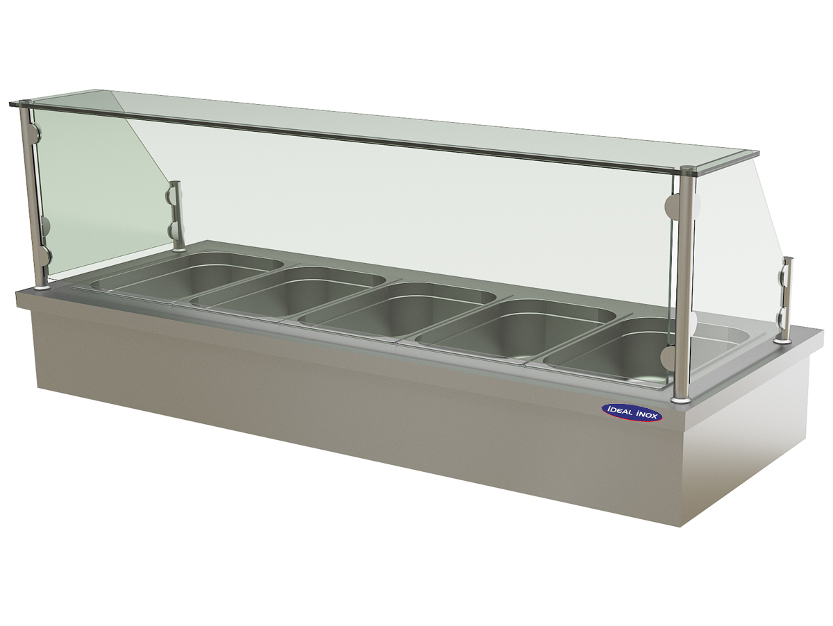 Unitate de servire calda tip Bain Marie cu baza dreptunghiulara, sistem de incalzire cu termostat ajustabil 30...+120C, robinet de scurgere a apei si suprastuctura; geam, constructie inox, capacitate 5 tavi tip gastronom 1/2. Pentru cuva Bain Marie folosim inox de cea mai buna calitate, ASI 304 (inox alimentar).