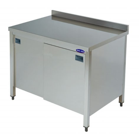 Masa de lucru inox cu rebord, polita intermediara si usi glisante, blat lucru cu margini rotunjite, picioare din profil inox rectangular 400x400 mm - confera stabilitate, reglabile pe inaltime, finisaj scotch brite. Pentru blatul de lucru al meselor folosim inox de cea mai buna calitate, AISI 304 (inox alimentar).
